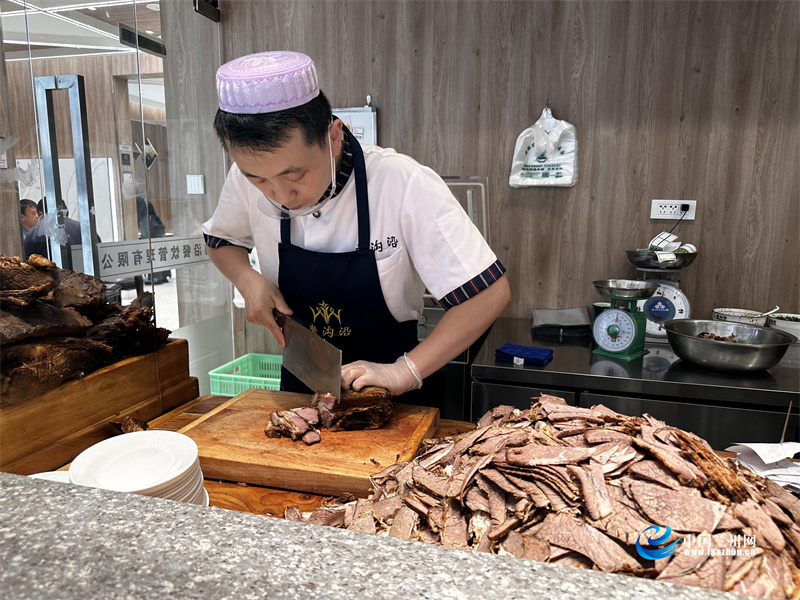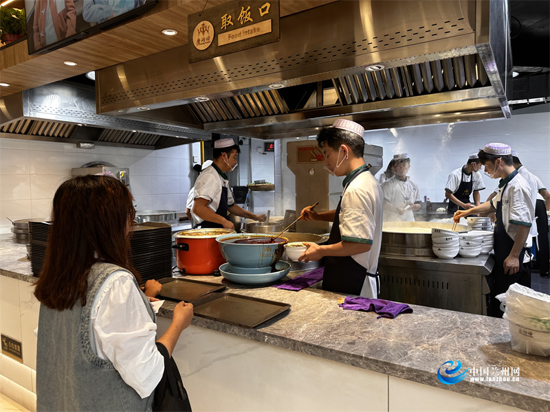 磨溝沿牛肉面的第一家門店——七里河區文化宮店開設于1999年,從最初的20平方米的平房起步,發展到擁有10家直營店、總面積達到2500平方米的經營規模,最“年輕”的隴能家園店于2021年開業,每天出面量達到1800碗以上,賣出300—500斤的生牛肉。磨溝沿牛肉面以優質牛肉、有機面條搭配骨湯、特色輔料而聞名,面粉選擇塞北雪品牌,牛肉每天從張掖武威正規大型養殖場采購,經過嚴格的工序煮出來的牛肉軟爛,深受食客喜愛。“我們的面比較勁道,湯比較濃,辣椒香而不辣。滿足本地食客的同時,也符合外地食客口味。這個假期,我們店外地游客能達到一半。”磨溝沿牛肉面隴能家園負責人馬福斌說。